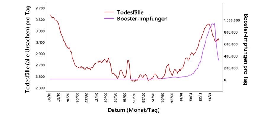 7.1. Seit vielen Wochen versterben in Deutschland und europaweit deutlich mehr Menschen als in den Vorjahren (Übersterblichkeit). Die Gründe dafür sind nach wie vor nicht zufriedenstellend geklärt. In den folgenden Analysen wird untersucht, inwiefern möglicherweise ein Zusammenhang zwischen der beobachteten Übersterblichkeit und der Anzahl der verabreichten COVID-Impfungen besteht. Dazu wird anhand der vom Statistischen Bundesamt veröffentlichten Sterbefallzahlen, der vom RKI veröffentlichten Zahlen zur Anzahl der COVID-Todesfälle (Sterbedatum) und der Anzahl der verabreichten Erst-, Zweit- und Booster-Impfungen, sowie der von Our World in Data veröffentlichten Daten zur Anzahl der Booster-Impfungen und der Übersterblichkeit in verschiedenen Ländern analysiert, inwiefern der Verlauf der Übersterblichkeit mit dem Verlauf der Impfungen zeitlich zusammenhängt. Die Ergebnisse