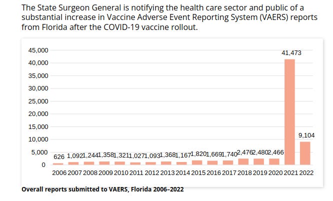 Wenn Sie mir ein wenig Spielraum gewähren, Herr Abgeordneter, werde ich mich zunächst mit Daten aus dem US-Bundesstaat Florida und den dort gemeldeten Impfschäden befassen. Vor der Covid-Pandemie gab es nie mehr als 2.500 Vorfälle pro Jahr, die dem Chirurgischen Generalarzt des Staates als direkte Folge von Impfungen gemeldet wurden. Im Jahr 2021 schoss diese Zahl auf über 41.000 Fälle hoch - ein Anstieg um mehr als 1.600 %. Natürlich werden einige verständlicherweise darauf hinweisen, dass der Anstieg der Fälle unvermeidlich war, da mehr Impfstoffe verabreicht wurden. Die Antwort darauf, geehrter Vorsitzender, ist, dass im Bundesstaat Florida die Zahl der verabreichten Impfstoffe im Jahr 2021 um 400 % gestiegen ist, nicht um 1.600 %. Im Bundesstaat Florida und im Rest der Welt gehen 1.600 nicht in 400 über; das war nie der Fall und wird es auch nie sein.