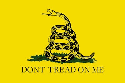 Man beachte die Symbolik der Gadsden Flag. Die Haltung ist nicht auf Angriff eingestellt, sondern auf Verteidigung, Es ist eine Haltung mit Prinzipien: mit ihrer Klapper warnt die Schlange den Despoten, ihr nicht zu nahe zu treten; ihr zusammengerollter Leib ruht fest und verteidigungsbereit auf ihrem grünen Fleckchen Erde, das Maul ist aufgerissen und bereit, jedem Eindringling einen giftigen Biss zu verpassen.