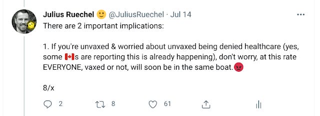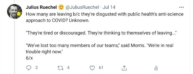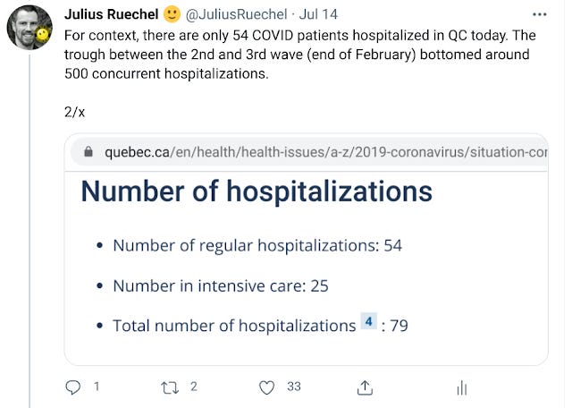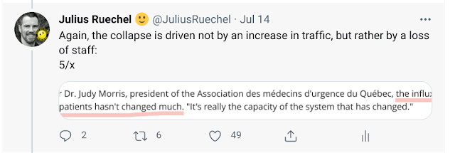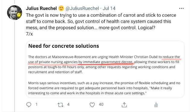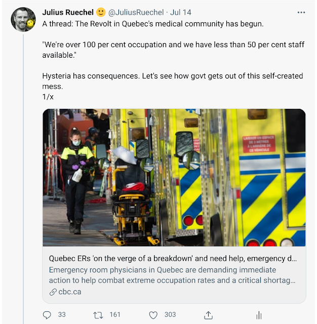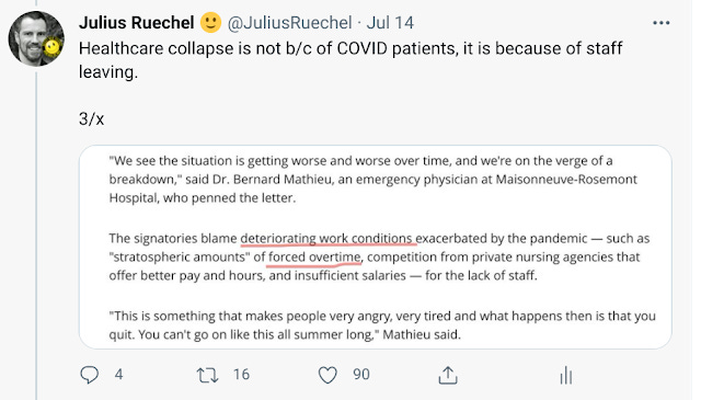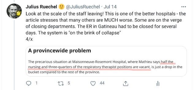 Das Gesundheitswesen von Quebec steht am Rand des Zusammenbruchs, weil seit Beginn von COVID ein Massenexodus des medizinischen Personals stattfindet (siehe meinen Thread auf Twitter). Manche Krankenhäuser haben bereits mehr als die Hälfte ihres Personals verloren.