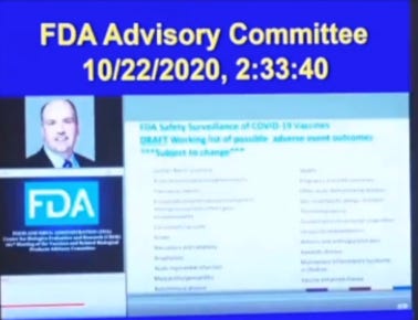 Während der Impfstoffvorstellung von Pfizer vor der Notfallzulassungsbehörde im letzten Oktober wurde diese Folie etwa eine Sekunde lang eingeblendet. Sie listet alle unerwünschten Nebenwirkungen auf, die schließlich Monate später in den Krankenakten auftauchten. Herzinfarkte, Schlaganfälle, Myokarditis, Perikarditis, Guillain-Barre-Syndrom, Blutgerinnsel, Todesfälle und verstärkte Impfallergien. Trotzdem erteilte die FDA die Notfallzulassung ohne irgendeine Erwähnung in den Mitteilungen an Ärzte oder Patienten. Sie wussten davon und sagten offenbar nichts. Vielleicht können es die Faktenchecker, aber ich kann das nicht rechtfertigen.