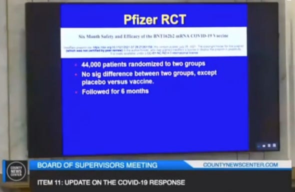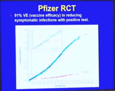 Der beste Weg, ein medizinisches Thema zu betrachten, ist eine randomisierte, kontrollierte Studie (RCT). Eine gut durchgeführte RCT ist aussagekräftiger als Dutzende von Beobachtungsstudien, weil sie eine Kontrollgruppe hat. Das hat Pfizer getan. Um seinen Impfstoff und um eine EUA (Emergency Use Authorization = Notfallzulassung) zu erhalten, hatte man 44 000 Patienten mit zwei großen Gruppen, die in jeder Hinsicht in allen Aspekten gleich waren, außer dass die eine Gruppe den Impfstoff und die andere Gruppe das Placebo erhielten.
