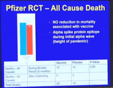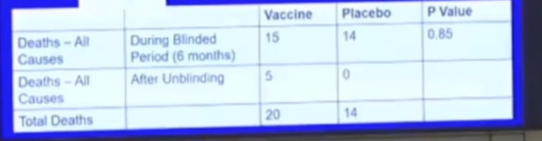 Und der Endpunkt, der uns alle am meisten interessieren sollte, ist die Gesamtmortalität. Sterblichkeit ist der große Faktor, denn er beendet all die albernen Argumente darüber, was den Tod verursacht hat. War es der Impfstoff, das Virus oder etwas anderes? Man zählt einfach die Todesfälle zusammen, und am Ende von sechs Monaten schaust du dir die Gesamtzahlen an. In dieser Studie starben 15 Patienten in der Impfstoffgruppe gegenüber 14 in der Placebogruppe.