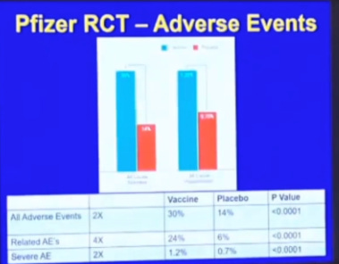 Worüber jedoch nicht gesprochen wurde, sind die die vermehrten unerwünschten Nebenwirkungen. Beim Impfstoff ist die Gesamtzahl der unerwünschten Ereignisse (=Nebenwirkungen) ist insgesamt doppelt so hoch, die in Verbindung stehenden unerwünschten Ereignisse viermal so hoch und schweren unerwünschten Ereignisse doppelt so hoch. Im Wesentlichen sind dies bei den schweren Nebenwirkungen Krankenhausaufenthalte, Herzinfarkte, Schlaganfälle, Herzbeutelentzündung, Guillain-Barré usw. Alle diese Unterschiede waren statistisch hoch signifikant