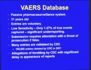 VAERS ist also ein Frühwarnsystem. Wenn ein Problem erkannt wird, kann es weiter untersucht werden. Es ist 31 Jahre alt, Einträge dort sind freiwillig, es gibt keine Meldepflicht. Es gibt eine erhebliche Differenz zu den tatsächlichen Fällen (Meldungen erfolgen nur selten = underreporting), das Eintragen einer Falschmeldung wird strafrechtlich verfolgt und die CDC (vergleichbar dem RKI) validiert alle diese Einträge. Über 150000 wurden allein in diesem Jahr entfernt.