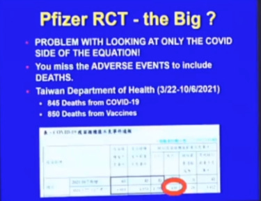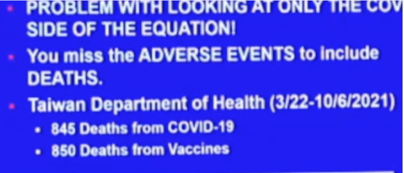 Das ist wirklich das große Problem mit dieser zwanghaften Fixierung auf COVID Infektionen und Tod und ob es die Geimpften oder die Ungeimpften sind. Dabei übersieht man, dass diese (Fixierung) die Hälfte des Problems ausblendet, nämlich die unerwünschten Nebenwirkungen und Todesfälle durch den Impfstoff. Wenn man die Impfung überlebt, ist man wahrscheinlich besser dran, vor allem im Frühstadium. Aber zu welchen Kosten? Die taiwanesische Gesundheitsbehörde bestätigt, dass derzeit etwas mehr Menschen durch die COVID Impfstoffe gestorben sind als an dem Virus selbst.