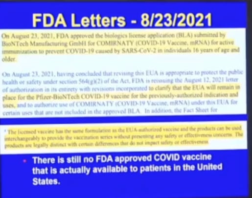 Am 23. August verschickte die FDA zwei Briefe. Der erste genehmigte den Corminaty Impfstoff und der zweite verlängerte die Notfallzulassung für den Impfstoff von Pfizer/Biontech. Die gleiche Formulierung, aber rechtlich unterschiedlich. Bis zum heutigen Tag gibt es keine von der FDA zugelassenen COVID Impfstoffe, die tatsächlich in den Vereinigten Staaten verfügbar sind. Corminaty ist nicht erhältlich. Wenn also die FDA den Impfstoff zulässt, er aber nicht erhältlich ist, stellt sich die Frage, ob die FDA den Impfstoff tatsächlich genehmigt hat.