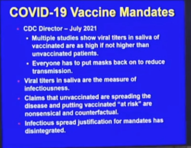 Ende Juli erklärte die CDC, dass die viralen Titer des Speichels der Geimpften genauso hoch sind wie bei den Ungeimpften. Dies war die Rechtfertigung dafür, dass alle wieder eine Maske aufsetzen mussten. Der Virustiter im Speichel ist der Maßstab dafür, wie infektiös man ist. Die damit begründete Behauptung, die Ungeimpften seien der Verbreiter der Krankheit und würden paradoxerweise die Geimpften gefährden, ist daher Unsinn. Allein diese Tatsache zerstört eine Impfpflicht auf Basis einer Rechtfertigung mit Ausschluss einer infektiösen Ausbreitung (von Geimpften).