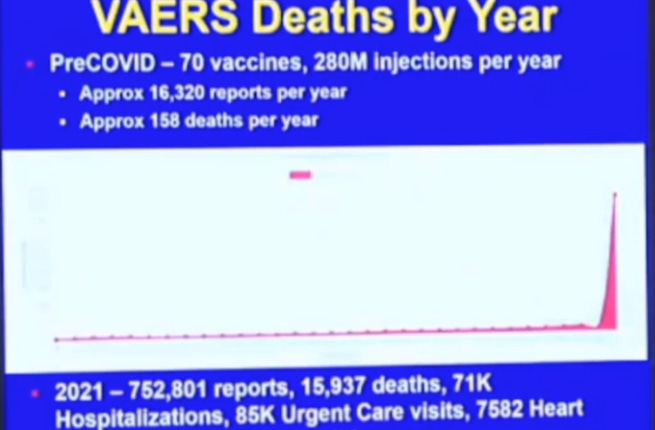 Es gab im Durchschnitt 158 Todesfälle pro Jahr im Zusammenhang mit allen eingesetzten Impfstoffen und dann passiert etwas. Seit Januar 2021 haben wir jetzt über 17 000 Todesfälle allein für die COVID Impfstoffe gemeldet. Ich möchte Ihnen das als ein Frühwarnsystem erklären, das genau wie beabsichtigt funktioniert. Wir hören einfach nicht darauf