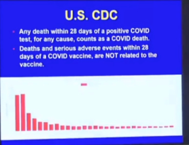 Die CDC erklärt, dass jeder Todesfall innerhalb von 28 Tagen nach einem positiven Test unabhängig von der Ursache als COVID Todesfall zählt. Von einem Zementlaster beim Überqueren der Straße überfahren werden ist kein realer COVID Todesfall, aber wenn Ihr COVID Test vor drei Wochen positiv war, werden Sie als COVID Todesfall gezählt. Andererseits steht alles, was innerhalb von 28 Tagen nach einer Impfung passiert, nie mit dem Impfstoff in Zusammenhang. Stellen Sie sich die Welt vor, in der wir leben würden, wenn diese Annahmen umgedreht wären.