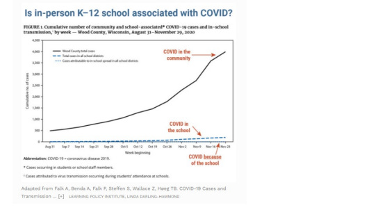 Es gibt eine Reihe amerikanischer Studien, die niedrige Raten der COVID-19-Übertragung in Schulen dokumentieren. Diese Studien aus North Carolina (Zimmerman, 2021), Wisconsin (Falk, 2021) und Utah (Hershow, 2021) ergaben alle, dass weniger als 5 % der COVID-Fälle in Schulen von der Schule ausgingen, während über 95 % der Kinder in der Gemeinde oder zu Hause infiziert wurden und dann bereits infiziert zur Schule kamen. Ich war leitende Autorin (traditionell an letzter Stelle aufgeführt) der von der CDC veröffentlichten Wisconsin-Studie (Falk, 2021).Der Umfang der schulinternen Übertragung und der in der Schule festgestellten Fälle ist nachstehend aufgeführt. Nur 7 der 191 (3,7 %) Fälle unter den Schülern wurden in der Schule übertragen.