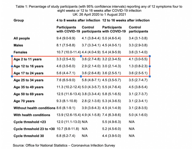 Bezüglich der Sorge um eine Auftreten von Long-Covid bei Kindern gibt es folgendes zu sagen: Unser Verständnis von Long-Covid in dieser Altersgruppe hat sich ständig weiterentwickelt. Es wird immer deutlicher, dass es bei der Untersuchung dieser Erkrankung unerlässlich ist, eine Kontrollgruppe und eine ausreichend große Anzahl von Probanden einzubeziehen. In diesem jüngsten Bericht des Office of National Statistics (ONS, 2021) im Vereinigten Königreich unterschied sich die Prävalenz anhaltender Symptome 12-16 Wochen nach einer COVID-Infektion nicht von derjenigen der Kontrollgruppe. Insbesondere ist zu beachten, dass in der Altersgruppe der 2-11-Jährigen weniger Symptome bei den 2-11-Jährigen gemeldet wurden, die eine COVID-Infektion hatten, als bei denen, die keine COVID-Infektion hatten (allerdings war dies nicht signifikant).
