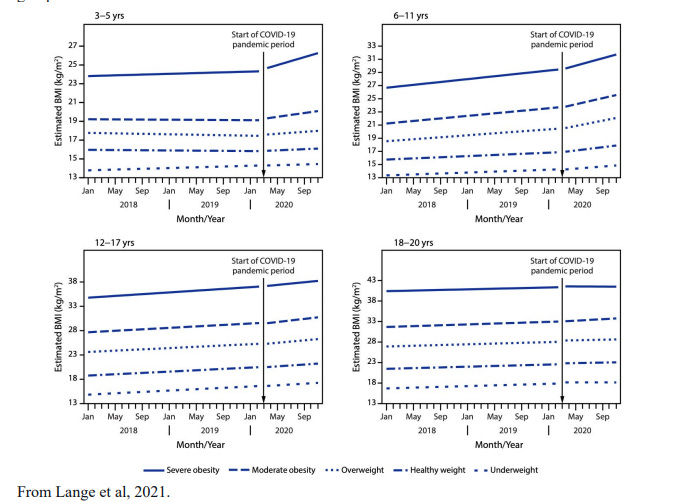Eine kürzlich von der CDC veröffentlichte Studie (Lange, 2021) fand heraus, dass sich bei "432 302 Personen im Alter von 2-19 Jahren […] die monatliche Zuwachsrate des BMI(Body-Mass-Index während der COVID-19-Pandemie im Vergleich zur Zeit vor der Pandemie fast verdoppelt hat". Dies schien die Altersgruppe der 3-11-Jährigen am stärksten zu treffen.