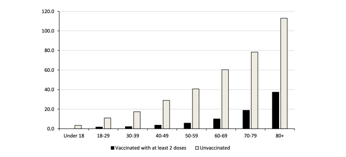 Jüngste Daten von Public Health England (PHE, 2021) haben ebenfalls ergeben, dass ungeimpfte Kinder im Vergleich zu vollständig geimpften 40-49-Jährigen ein geringeres Risiko für eine Krankenhauseinweisung haben (3,4/100.000 gegenüber 3,6/100.000 während dieses zweiwöchigen Studienzeitraums)