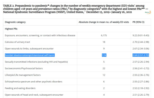 Eine weitere von der CDC veröffentlichte Studie (Adjemian, 2021) ergab einen relativen 2,6-fachen Anstieg der Besuche in der Notaufnahme wegen Suizidgedanken, -versuchen oder absichtlicher Selbstverletzung bei Kindern unter 18 Jahren.