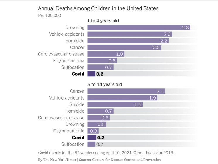 Dies ist eine wichtige Perspektive für die Entwicklung der öffentlichen Gesundheitspolitik, wenn ungeimpfte Kinder als ähnlich risikobehaftet wie ungeimpfte Erwachsene in ihren Vierzigern angesehen werden sollen. Was das Sterberisiko für Kinder betrifft, so sollte COVID-19 auch im Kontext anderer Risiken betrachtet werden. COVID-19 hat ein geringeres jährliches Sterberisiko für Kinder als Autogunfälle, Influenza (nach dieser Schätzung) und, was für die 5-14-Jährigen vielleicht am wichtigsten ist, Selbstmord (Leonhardt, 2021).