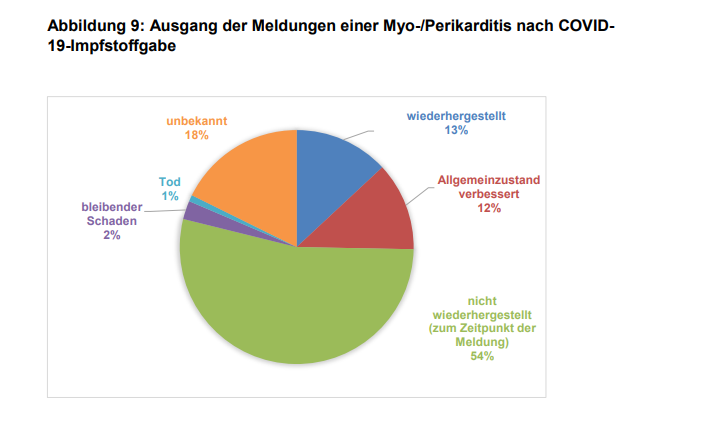 Die Ärztin, die sich für die Impfung ausspricht stellt die Behauptung auf, dass die bisher aufgetretenen Herzmuskelentzündungen bei Kindern und Jugendlichen alle reversibel gewesen sein. Das Gericht entgegnet dieser Behauptung mit einem Verweis auf den Sicherheitsbericht des Paul-Ehrlich-Instituts von Ende 2020 . In einem Kuchendiagramm auf Seite 27 ist klar zu sehen, "dass in 54% der gemeldeten Fälle die Patienten zum Zeitpunkt der Erhebung noch nicht wiederhergestellt waren."