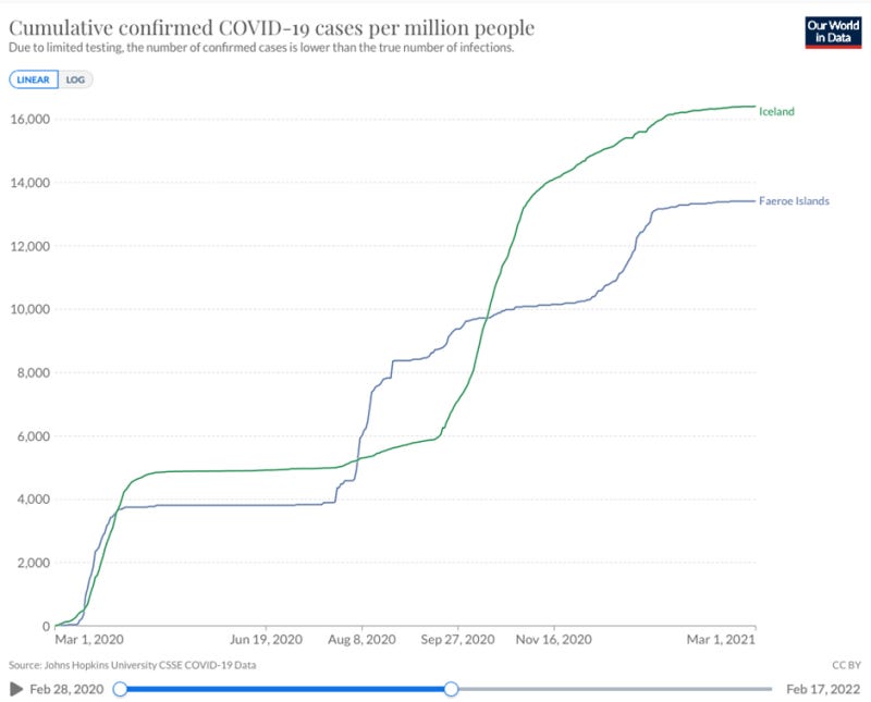 Es ist aufschlussreich, die Entwicklung der COVID-19-Pandemie im ersten Jahr (bevor Impfstoffe zur Verfügung standen) auf den Färöern und im benachbarten Island zu vergleichen, einem weiteren winzigen Land, das in Bezug auf Kultur und Lebensstandard sehr ähnlich ist. Obwohl Island (trotz gegenteiliger Behauptungen) strenge Maßnahmen ergriff, Schulen schloss, Bars und Restaurants, Friseure und andere Dienstleistungsbetriebe zeitweise schloss und Versammlungen streng einschränkte, blieb die Ausbreitung der Infektionen in den beiden Ländern in diesen ersten 12 Monaten weitgehend gleich.