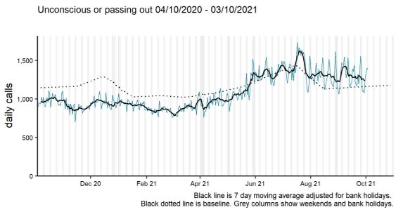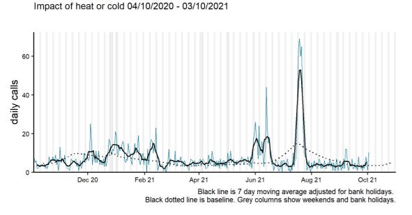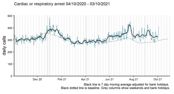 Ab Mai 2021 ist in England ein deutlicher Anstieg der Notrufe bei Herz- und Atemstillstand sowie bei Bewusstlosigkeit zu verzeichnen (siehe Abbildungen 1a und 1b). Es gab zwei Perioden mit Hitzewellen, die sich kurzzeitig auf den Anstieg ausgewirkt haben könnten, aber im Allgemeinen bleibt der Anstieg unerklärt. Der Zeitpunkt und das Ausmaß der Hitzewellen sind in den Daten zu den Krankenwageneinsätzen aufgrund der direkten Auswirkungen der Hitze ersichtlich (siehe Abbildung 1c).
