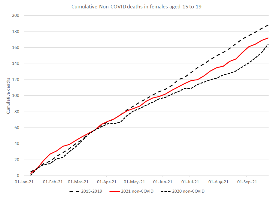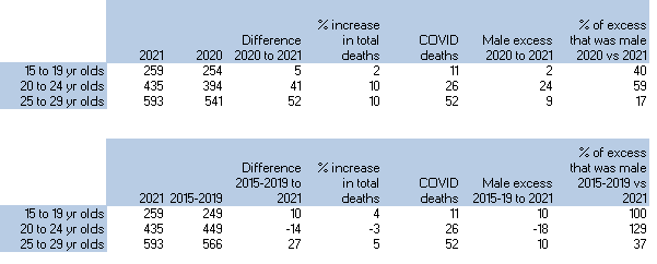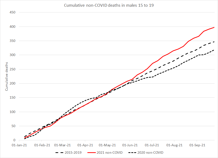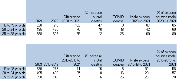 Die Mortalitätsdaten für England und Wales, die vom 1. Mai 2021 bis zum 17. September 2021 vom ONS (Amt für nationale Statistiken) erhoben wurden, zeigen einen erheblichen Überschuss, insbesondere in der Altersgruppe der 15- bis 19-Jährigen. Je nach gewählter Basislinie liegt der Überschuss bei den 15- bis 19-Jährigen zwischen 16 % und 47 % über den erwarteten Werten (siehe Tabelle 1 und 2). Die Zahl der COVID-19-Todesfälle war zu gering, um die Überschreitung zu erklären. Eine unverhältnismäßig große Zahl dieser übermäßigen Todesfälle betraf Männer. Ein gewisses Maß an zufälligen Schwankungen wäre zu erwarten, aber ein Anstieg dieses Anteils ist groß genug, um ihn nicht ohne weitere Untersuchungen zu verwerfen.