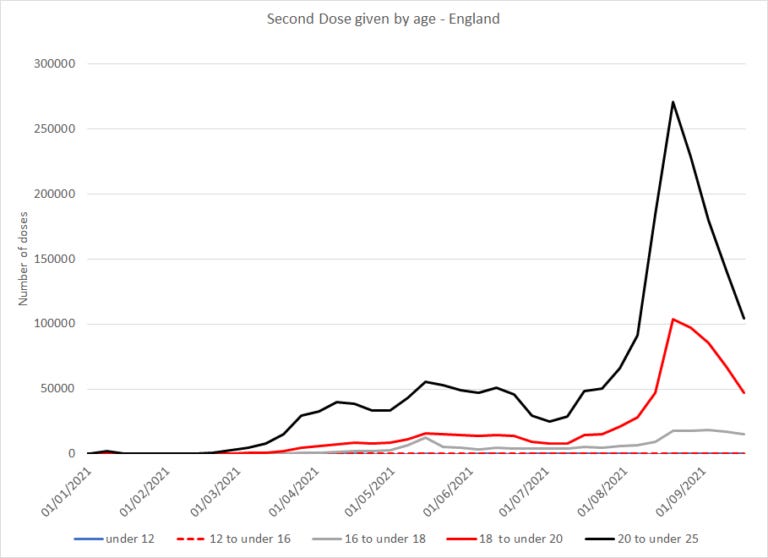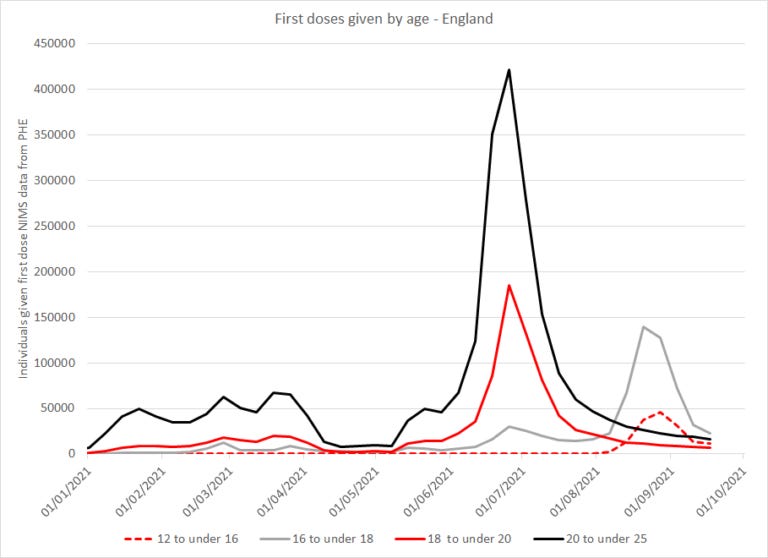 Die Daten von PHE(Public Health England), die zur Erstellung der obigen Diagramme verwendet wurden, sind ein umfassendes nationales System, das National Immunisation Management System (NIMS). Obwohl ein Teil der Daten zeitnah erhoben wird, gibt es jedoch eine Verzögerung von einigen Wochen, bevor der gesamte Datensatz vollständig ist. Diese Verzögerung bedeutet, dass der Abwärtstrend ab Anfang September durchaus artefaktisch sein kann. Es ist jedoch klar, dass die meisten Impfungen in dieser Altersgruppe seit Mai durchgeführt wurden.