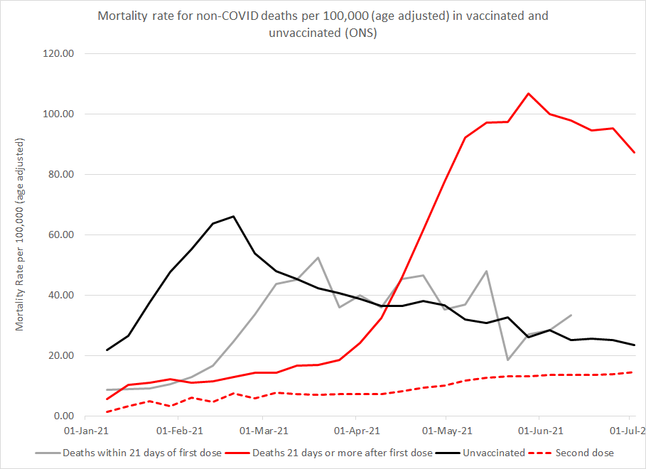 Das ONS veröffentlichte in seinem Bericht nicht die Rohdaten, sondern gab stattdessen altersbereinigte Sterberaten an. Auf diese Weise trägt der Tod eines jungen Menschen mehr zur altersbereinigten Sterblichkeitsrate bei als der Tod eines älteren Menschen, weil die Zahl der Todesfälle in der erstgenannten Altersgruppe so viel geringer ist als in der letzteren. Die Daten, die zusammen mit dem Papier vorgelegt wurden, zeigen einen dramatischen Anstieg der nicht-COVID-19-Sterblichkeitsrate bei denjenigen, die mehr als 21 Tage vor der ersten Dosis geimpft wurden, beginnend im April 2021 und eskalierend im Mai 2021. Obwohl einige 18- und 19-Jährige im August eine zweite Dosis erhalten haben könnten, hat die Mehrheit (78 % laut den in Woche 38 gemeldeten Daten) der geimpften 12- bis 17-Jährigen nur eine erste Dosis erhalten. Daher würden sie größtenteils in die Kategorie der "mehr als 21 Tage zuvor mit einer ersten Dosis geimpften" fallen. Die altersbereinigte Sterblichkeitsrate für diese Gruppe lag im Winter um 60 % höher als die Spitzensterblichkeitsrate für nicht geimpfte Personen.