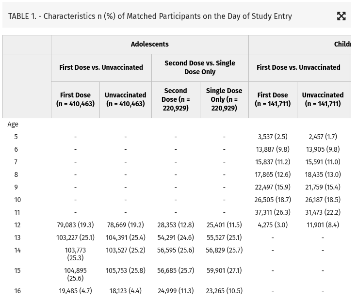 In beiden Gruppen mit jeweils ca. 16.000 Kindern gab es weder Corona-Todesfälle noch intensivmedizinische Belegungen aufgrund von Corona. In beiden Gruppen kam es zu drei Krankenhauseinweisungen mit positivem Corona-Test. Die geimpften Kinder hatten jedoch mehr nicht Corona bedingte Besuche in der Notaufnahme (4.107 zu 3.909) und mehr ungeplante Hospitalisierungen (417 zu 381). Auch in dieser Gruppe kam es nur in der geimpften Gruppe zu drei Fällen von Perikarditis. Bei den ungeimpften Kindern war dies nicht der Fall.