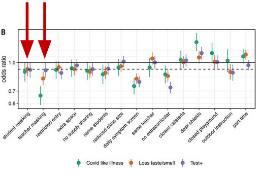 Trotz des großen Interesses am Masketragen von Kindern in den Vereinigten Staaten gibt es nur wenige Studien mit Ergebnissen, die eine Maskenpflicht für Schüler in Schulen eindeutig unterstützen. Außerdem können diese Aufforderungen das Lernen erheblich beeinträchtigen. Eine viel beachtete Studie in der Zeitschrift Science stützte sich auf die Ergebnisse einer Facebook-Umfrage, berücksichtigte nicht die Testniveaus in verschiedenen Bereichen und fand nur dann signifikante Unterschiede beim Masketragen von Lehrern (dargestellt durch den hinzugefügten roten Pfeil, rechts), wenn COVID-ähnliche Erkrankungen (CLIs) gezählt wurden (grün), während beim Masketragen von Schülern (hinzugefügter roter Pfeil, links) keine Unterschiede festgestellt wurden, wenn positive Nukleinsäure-Amplifikationstests-Ergebnisse erforderlich waren (lila).