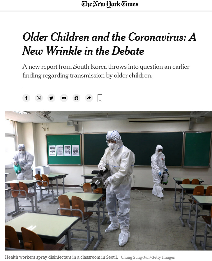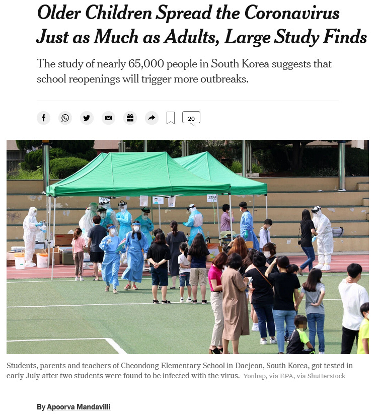 Trotz dieser frühen Beweise gab es in den Medien zahlreiche Berichte und Spekulationen über die Verbreitung von SARS-CoV-2 bei Kindern. Am 18. Juli 2020 berichtete die New York Times über eine Studie aus Südkorea, in der behauptet wurde, dass Kinder SARS-CoV-2 genauso leicht verbreiten wie Erwachsene.