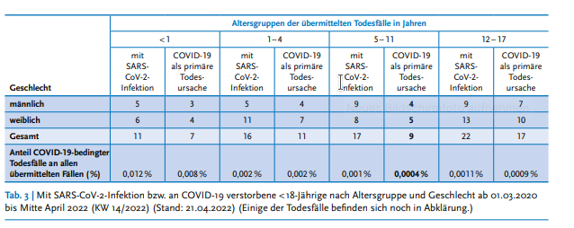 Bis zum 21. April 2022 "wurden an das RKI 9 Todesfälle im Alter von 5 – 11 Jahren übermittelt, bei denen COVID-19 als Todesursache angegeben war. Alle Kinder litten bereits vor der COVID-19-Erkrankung an schweren Grunderkrankungen."