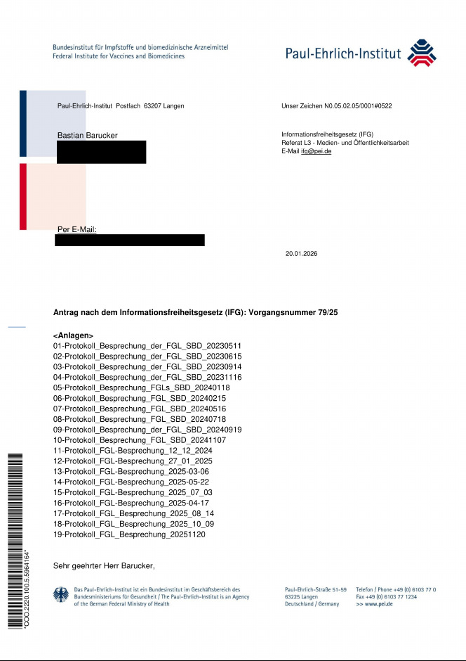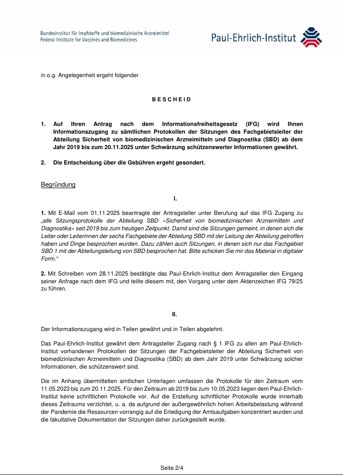 «Die im Anhang übermittelten amtlichen Unterlagen umfassen die Protokolle für den Zeitraum vom 11.05.2023 bis zum 20.11.2025. Für den Zeitraum ab 2019 bis zum 10.05.2023 liegen dem Paul-Ehrlich Institut keine schriftlichen Protokolle vor. Auf die Erstellung schriftlicher Protokolle wurde innerhalb dieses Zeitraums verzichtet, u. a. da aufgrund der außergewöhnlich hohen Arbeitsbelastung während der Pandemie die Ressourcen vorrangig auf die Erledigung der Amtsaufgaben konzentriert wurden und die fakultative Dokumentation der Sitzungen daher zurückgestellt wurde.»