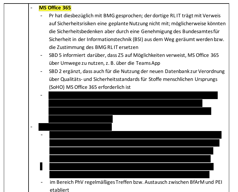 Fun Fact: Bei Fragen zur internen Nutzung von Microsoft-Produkten ist vermerkt, dass die Nutzung von MS Office 365 aufgrund von Sicherheitsrisiken vom Bundesgesundheitsministerium (BMG) «nicht mitgetragen» wird.