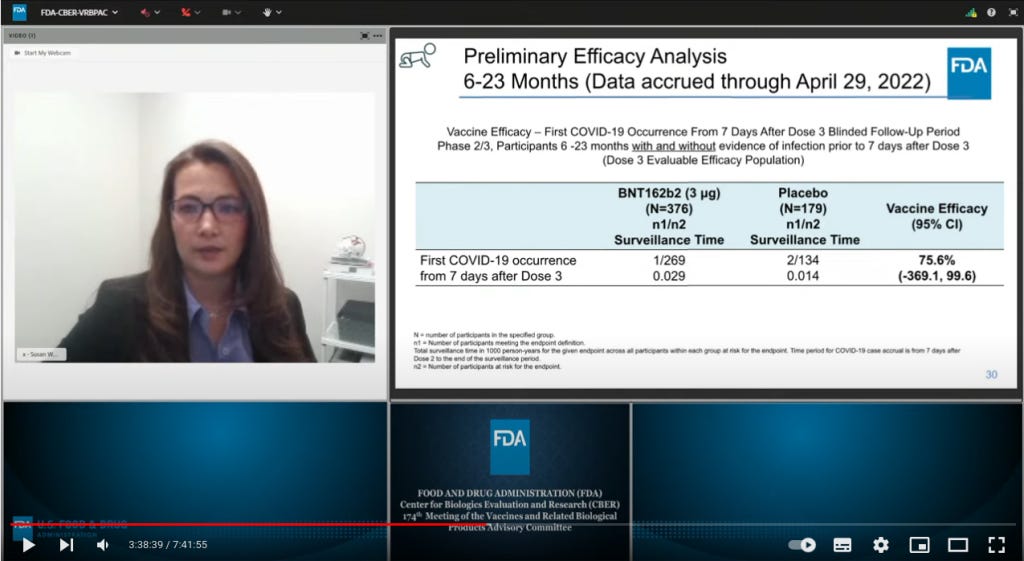 Mitte Juni 2022 fand ein Online-Meeting der US-amerikanischen Arzneinmittel-Zulassungsbehörde (FDA) statt. Es tagte der "beratende Ausschuss für Impfstoffe und verwandte biologische Produkte" (VRBPAC), um Modernas Antrag auf Notfallzulassung für einen COVID-19-Impfstoff für Kinder im Alter von sechs Monaten bis fünf Jahren sowie Pfizers Antrag auf Notfallzulassung für einen entsprechenden Impfstoff für Kinder im Alter von sechs Monaten bis vier Jahren zu erörtern. Die zu diesem Zeitpunkt verfügbare Datenlage sprach bereits eindeutig dafür, dass Sars-Cov2 für Kinder in dieser Altersgruppe keine besondere Gefahr darstellt, weshalb es eigentlich keinen faktischen Grund für einen Notfall und dementsprechend auch nicht für eine Notfallzulassung gab.