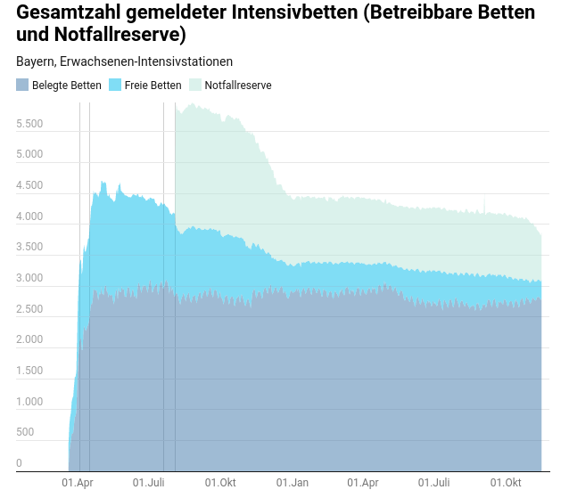 Ich schrieb eine letzte Mail mit der Bitte um Klarheit bzgl. seiner Aussagen und fügte ein Diagramm zur Auslastung der Intensivstationen in Bayern an. Auf diesem ist zu sehen, dass es zum Zeitpunkt unseres Mailverkehrs keine signifikante Mehrbelegung der Intensivstationen gab. Was jedoch deutlich zu sehen ist, ist der rasante Abbau von Betten und das mitten in der Pandemie. (7)