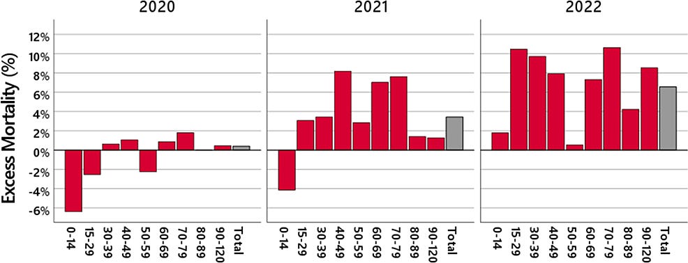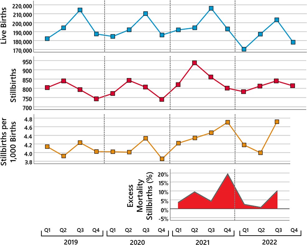 „Zusammengenommen würde man erwarten, dass die Impfung großer Teile der Bevölkerung die Übersterblichkeit verringert hätte. Das Gegenteil ist der Fall: Sowohl die Übersterblichkeit als auch die Zahl der Totgeburten stieg mit der Zunahme der Impfungen.“