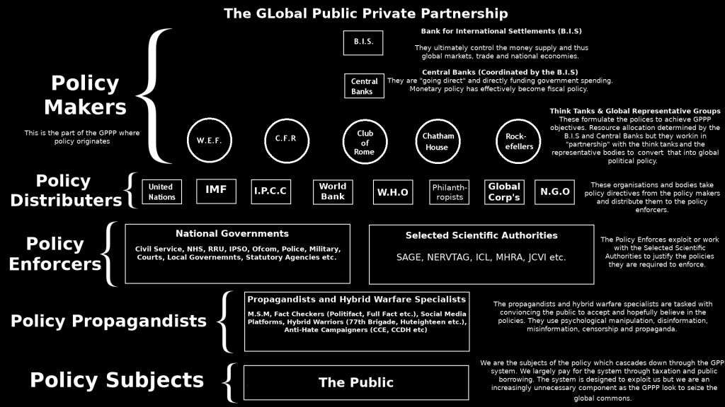 Die GPPP kontrolliert die globalen Finanzen und die Weltwirtschaft. Sie legt die weltweite, nationale und lokale Politik fest (über die Global Governance) und fördert diese Politik dann mit Hilfe der Mainstream-Medien (MSM), die ebenfalls "Partner" innerhalb der GPPP sind.